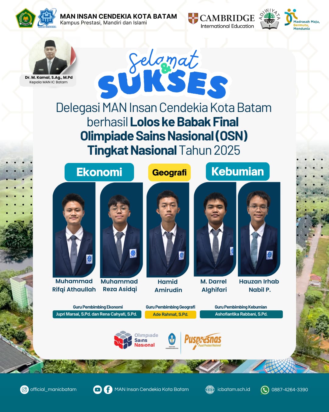 Batam – MAN Insan Cendekia (IC) Kota Batam kembali menorehkan prestasi membanggakan di ajang kompetisi sains bergengsi. Sebanyak lima orang siswa berhasil melaju ke babak final OSN Tingkat Nasional Tahun 2025 dan sekaligus menjadi perwakilan dari Provinsi Kepulauan Riau. Para siswa berhasil sampai ke babak final setelah melewati serangkaian seleksi ketat, mulai dari seleksi OSN-K, OSN-P, dan Semi Finalis OSN 2025.