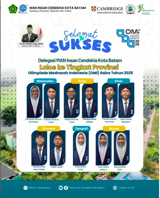 Batam– Prestasi membanggakan kembali diraih oleh MAN Insan Cendekia (IC) Kota Batam. Sebanyak 11 orang delegasi berhasil lolos ke tingkat provinsi pada ajang Olimpiade Madrasah Indonesia (OMI) Bidang Sains Tahun 2025. Mereka akan mewakili Kota Batam dalam OMI Tingkat Provinsi Kepulauan Riau yang akan digelar pada 2-3 Oktober 2025 mendatang sesuai dengan Juknis Pelaksanaan OMI.